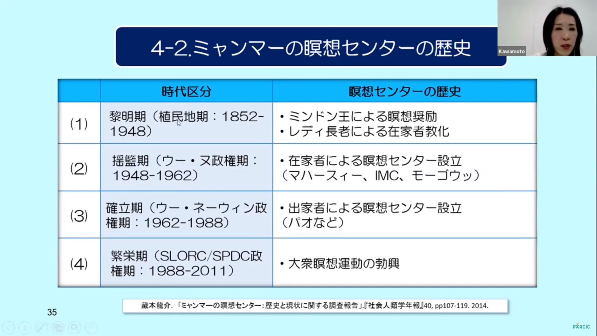 パルシック事務所インターンです。2022年2月4日に開催された「~知る・繋がる~ミャンマー連続講座」の第4回目は京都大学の川本佳苗先生をお迎えして『ミャンマー仏教の魅力 戒律と瞑想の世界』と題し、ミャンマー仏教への理解を深める会となりました。今回は川本先生のお話しについて報告させていただきます。